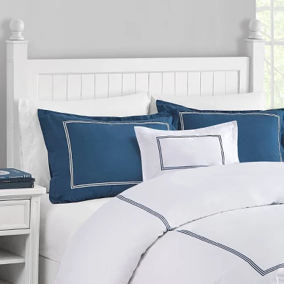 - Walk The Line Features A Hotel Inspired Comforter Set That Blue Borders The Outline Of The Bedding On Crisp White Ground The Reverse Is A Classic Blue That Comes Through On The Flange Of The Bedding For A Pop Of Color Accenting The Framed Top Of Bed The Shams In The Set Are A Fun Play On The Comforter As They Were Designed With The Blue Ground And White Outline To Coordinate In A Playful Way The Included Decorative Pillow Cover Mimics The Top Of The Comforter In A Smaller Scale Blue Border On A White Ground