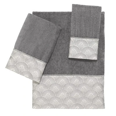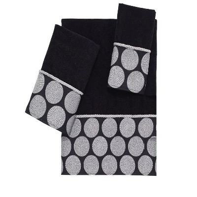 The Avanti Dotted Circles Black 3-Piece Decorative Towel Set features a jacquard woven border with multi-colored circles and metallic accents, finished with a coordinating rope trim. 100% cotton (exclusive of embellishment) black velour towel. Set includes one each of bath, hand and fingertip towel. Sewn in the US, imported materials.