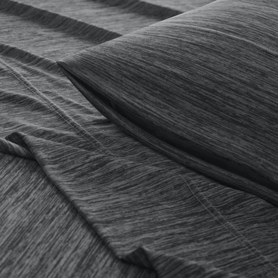 Dive into this cool and comfortable Urban Habitat jersey knit sheet set. Made from 50% nylon and 50% polyester, this blended fabric feels cool and breathable to even the hottest of sleepers. This silky smooth sheet set features heathered yarns to create a chic tonal look that pairs easily with any bedding set. Machine washable for easy care and wrinkle resistant. Fitted sheet fits up to 16″ of mattresses.