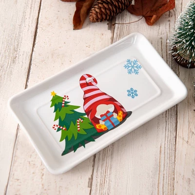 Add a whimsical holiday touch to your bathroom with the Gnomes Tray by Allure Home Creation. This festive oblong shaped tray with raised sides is decorated with an adorable gnome with a long beard and an oversized stocking cap sitting beside a decorative Christmas Tree. This personable character will bring the joy of the holiday season to your home. Made of 100% decaled ceramic. Hand wash.