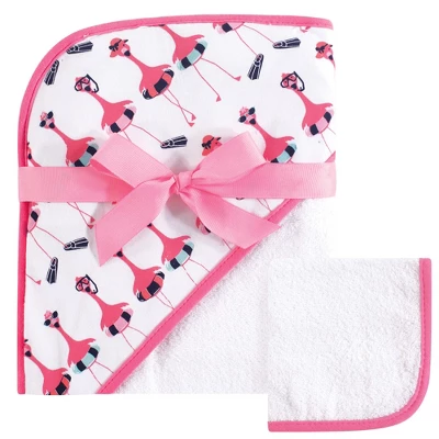 Hudson Baby Infant Girls Cotton Hooded Towel And Washcloth 2pc Set, Fancy Flamingo