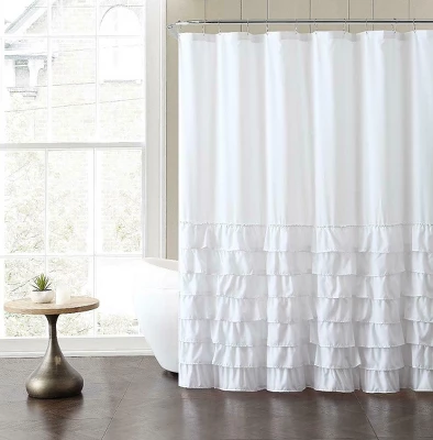 Add a charming touch to your bathroom decor with the Kate Aurora Living Ruffled Fabric Shower Curtain. The shabby chic design features a beautiful ruffled pattern, adding a romantic and feminine vibe to your space. Made of 100% premium woven polyester, the shower curtain is both durable and stylish. The reinforced hook holes ensure easy installation and long-lasting use. The curtain measures 72 inches wide by 72 inches long, making it suitable for most standard-sized shower spaces. Available in four different colors, including gray, white, taupe, and peach, you can choose the perfect hue to complement your bathroom decor. Maintaining the shower curtain is easy as it is machine washable. Simply toss it in the washing machine with like colors and tumble dry low. Avoid using bleach to preserve the quality of the fabric. Overall, the Kate Aurora Living Ruffled Fabric Shower Curtain is a stylish and practical addition to any bathroom. The shabby chic design, combined with the high-quality material, ensures that your bathroom will look elegant and inviting for years to come.