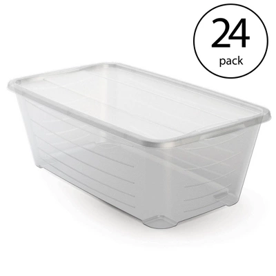 This package includes 24 shoe boxes.Keeping your off-season shoes stored and safe can be a chore. If you ever spend good money on a great pair, you don’t want to just toss them on the closet floor for a few months. Keep them in pristine condition by storing them in the Life Story 6-Quart Rectangular Clear Plastic Shoe Box.Perfect for both long-term storage or short-term while moving to a new home, this storage tote keeps dust and debris off shoes all year round. The tote holds 6 quarts of materials.This tote is made with durable plastic that’s UV and water-resistant and stackable. The clear walls make it easy to spot the pair you want.