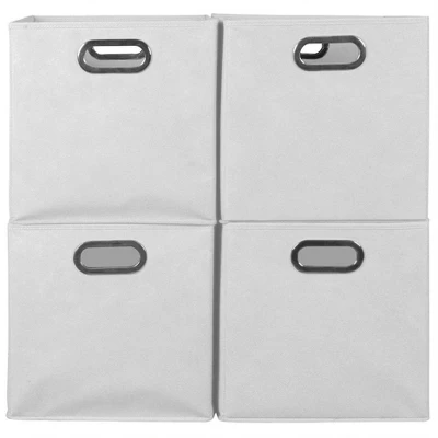 Find your Niche with versatile and modern Niche Fabric Storage Bins! Strong and durable, these bins each include a reinforced bottom panel that adds an extra layer of stability. With the bottom panel in place, they are sturdy enough to use on their own to hold files, scrapbook paper, children’s toys, towels, craft supplies and more. The bottom panel comes out and the entire bin folds flat for easy storage when not in use. Folded bins even fit perfectly inside an open one! Chrome handles are built into two sides of the bin, which makes carrying and moving it easy and worry-free. Inset handles are stronger than sewn-on cloth handles and won’t come unstitched or separate at the seams like cloth handles could. Measuring 12 x 12 x 12, Niche Fabric Bins are truly square and integrate seamlessly into Niche Cubo storage cubes. They can be used in any direction- there is no “right” side to face front because all sides measure the same! Personalize your bins by using the clear label holder on one side. Quickly and easily identify contents or assign bins to individual students. Ideal for every room in the house, make this set of 4 White Niche Folding Fabric Bins a part of your home or office today!