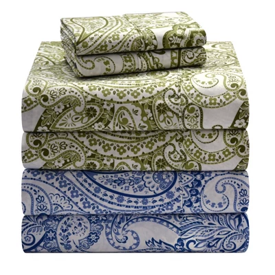 Pointehaven 200TC Percale Boho Paisley Printed pattern sheet set fabric is printed on percale woven with single-ply yarns for a crisp and breathable fabric. The classic paisley pattern in green or blue color can enlighten any bedroom with these long lasting easy care sheets.