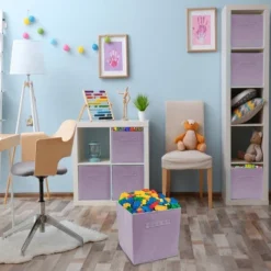 Perfect for organizing and cutting down on clutter, these Collapsible Storage Cubes add functionality to your cube organizer! Fabric drawers easily side in and pull out of cube shelves thanks to their sewn in handles! Both durable and easy to use, these Collapsible Storage Cubes are a terrific choice! These Collapsible Storage Cubes have been specially designed to fit perfectly with their Storage Cube counterparts. Together they form an unbeatable combination of color, organization, and style. Store anything from toys to laundry inside these sturdy cubes that feature bright colors with a strong handle. From wrangling household items to collecting unruly toys, camouflage and conceal some of the most common household eyesores. In the kid’s room, create a functional play area where Legos, books, and stuffed animals have a cozy cube to call home. Bins are lightweight, sturdy, and easy for kids to place on the floor to grab their favorite toy. When not in use, slide them underneath a bench or back inside your cube organizer stand until the next play date. These bins also transform a closet or laundry room when filled with linens, clothes, seasonal items, holiday ornaments, and much more. The possibilities are endless! The collapsible design assembles in seconds and folds flat for easy storage. Made of nonwoven polypropylene and cardboard with colorful lightweight fabric. Bins complement cube storage organizer shelves and provide adequate space to sort your clutter. A side handle allows for easy transportation. Measures approximately 11 inch L x 11 inch H x 10.5 inch W. Soften storage with lightweight bins that make a practical, attractive addition to any room.