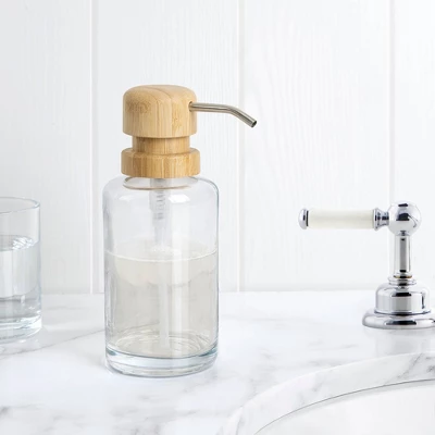 - Made of clear glass, push down chunky bamboo pump in a warm natural finish for easy dispensing Finished size: 3.14" x 3.14" x 7.68" Holds up to 14.0 oz of your favorite liquid hand soap or lotion