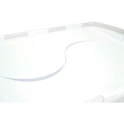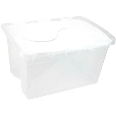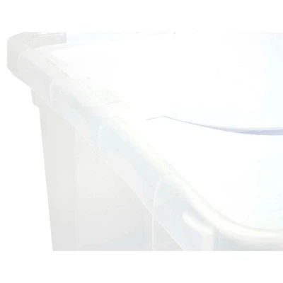 The 48 Quart Clear Hinged Lid Storage Box is a perfect all-purpose storage solution. The attached hinged lid allows for easy access to contents and will not be misplaced when opened. Integrated, contoured handles provide a comfortable grip for transporting, and a see-through base makes identifying contents quick and convenient. 22 3/8″ L x 15 7/8″ W x 13 1/8″ H.This Sterilite hinged lid 48 quart storage box hascapacity to allow for ample storage of your seasonal clothing, extra linens, toys, stuffed animals and so much more. The unique design of the Sterilite hinged lid storage box also allows for safe and sturdy stackable storage for the ultimate space saver. Use this wing lid storage box in your attic, garage or anywhere that you would like. The designers at Sterilite ensure that you will never lose your lid again with this wonderful hinged lid storage box. The wing lid storage box opens on both sides so you have plenty of room to work when packing, unpacking or searching for an item that someone mistakenly packed. Like many Sterilite storage totes, the Sterilite 48 qt hinged lid box is clear so you can find what you need quickly. – Hinged lid for easy access to contents – Integrated, contoured handles for easy carrying – Indexed lid for easy stacking – See-through base for quick identification of contents**We are an authorized Sterilite dealer.**