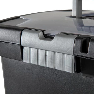 Finding a perfect solution for storing and moving your moving letter-size hanging file folders will be at ease with the 4-Pack of Sterilite Portable File Boxes. These organizers will undoubtedly help you organize your documents or transport file folders effectively.Features an easy-access, in-lid compartment, and divided sections that provide extra room for your pens, scissors, calculator, notepad, and other small things. The lid locks into place with the titanium gray latches, keeping everything sealed inside. Also, the clear lid makes it easy to check its contents without showing everyone what’s inside. With a top handle design, you can easily transport and carry these boxes. Stackable, and allows for efficient use of vertical space thanks to indexed cover design.The file box has a large capacity and fits letter-sized hanging files, making it perfect for keeping important documents safe. It can be locked shut with a small padlock ensuring the privacy and safety of your papers.Keep your documents safe in this 4-Pack of Sterilite Portable File Box.