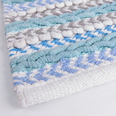 Pamper yourself with style and comfort with the Multi Stripe Cool Bath Rug by Allure Home Creation. This stylish design in a cool pallet of white, grey, aqua, light and medium blue, features a blend of textural designs woven together in a horizontal striped pattern adding lots of visual interest and dimension. This oblong bath rug is made of 100% cotton with a skid resistant latex backing. It measures 20″ x 30″ and will easily fit in most spaces where you want to create a cozy, soft spot to stand. Not only will this bath rug fashionably dress your bathroom, it will also help keep your floor clean and dry. Machine wash cold and tumble dry on low heat.
