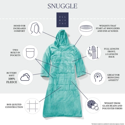 The Ella Jayne Performance Collection matches our classic style with attributes needed to help you fully refresh each day. Our Ella Jayne Weighted Snuggle is wearable to keep you cozy warm and safe no matter what day of the week. Wrap yourself with a warm hug in our wearable snuggle blanket! The weights start at your shoulders and end at your knees while the sleeves are not weighted so your arms can stay cozy and functional. The box-quilted construction keeps the filling from shifting and there are two built in pockets for your convenience of holding a remote phone or just keeping your hands warm while you cuddle up in luxury. This large oversized comfortable snuggle is a perfect fit for all shapes & sizes.